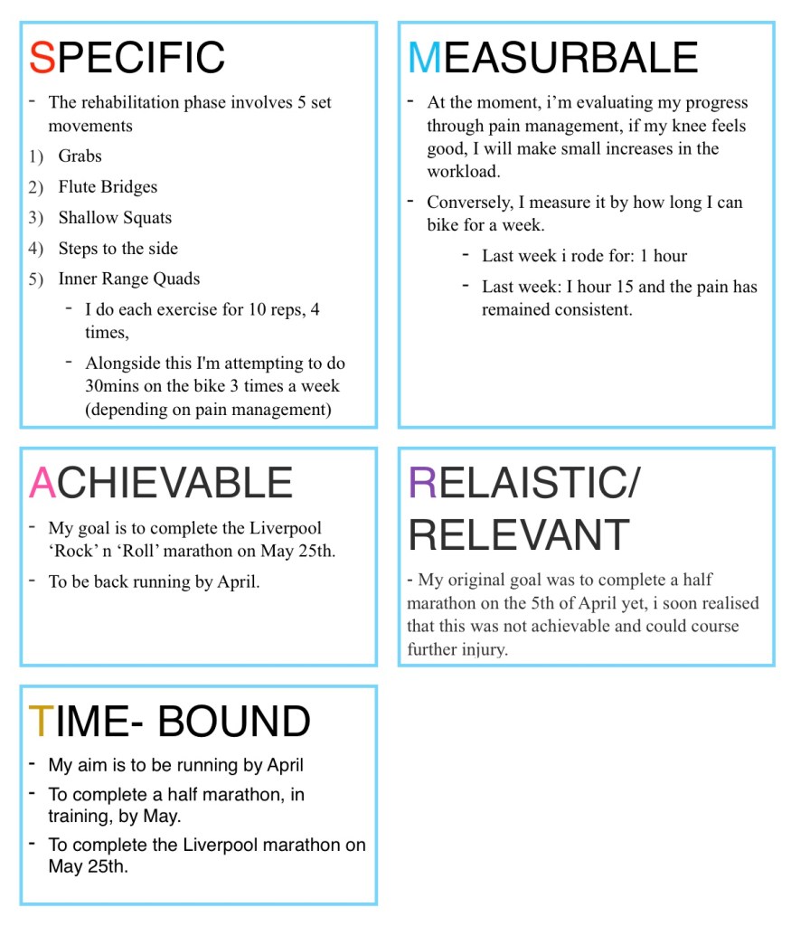By setting SMART goals, most importantly setting realistic goals, has enabled me to rationalise the next three weeks, thereby increasing the likelihood of recovering and being able to run again effectively. Additionally, Wade and Halligan (2004) suggested that its key to acknowledge that goals are hierarchical in nature; the first of which is time: the separation of short-term (being able to run), medium-term (completing a half marathon), and long-term goals (completing a marathon). The second of which is on a conceptual level, such as maintaining psychological and physiological well-being through social participation and activities. Currently, social participation is crucial to maintaining my goals, even though by attending the Born to Run lectures on both a Monday and Tuesday tend to leave me feeling negative about myself through not completing runs or the Anglesey Half marathon, its clear that by failing to attend lectures I would begin to isolate myself from the group leading to a decrease in motivation.